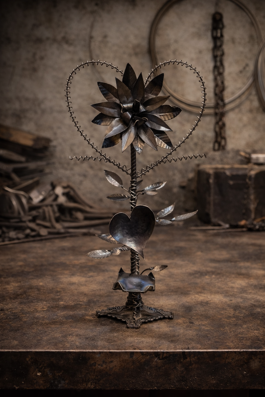 Železná, plechová kytice bez povrchové úpravy.